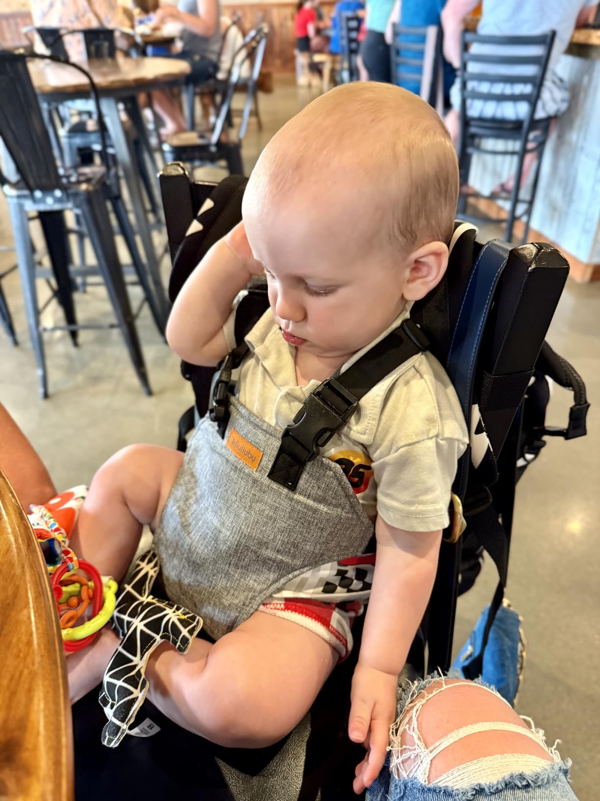 "Mi hijo tiene 9 meses y no le gusta estar en el coche, cuando salimos a restaurantes es un problema por eso, ahora lo sentamos en una silla con el cinturón de silla y le gusta"