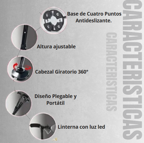 Nuestro bastón brinda una solución práctica, ligera pues su luz led incluida da mayor confianza y autonomía al caminar. Su diseño fue elaborado pensando en tu seguridad y libertad al desplazarte. Es práctico, plegable, elegante, resistente y liviano.