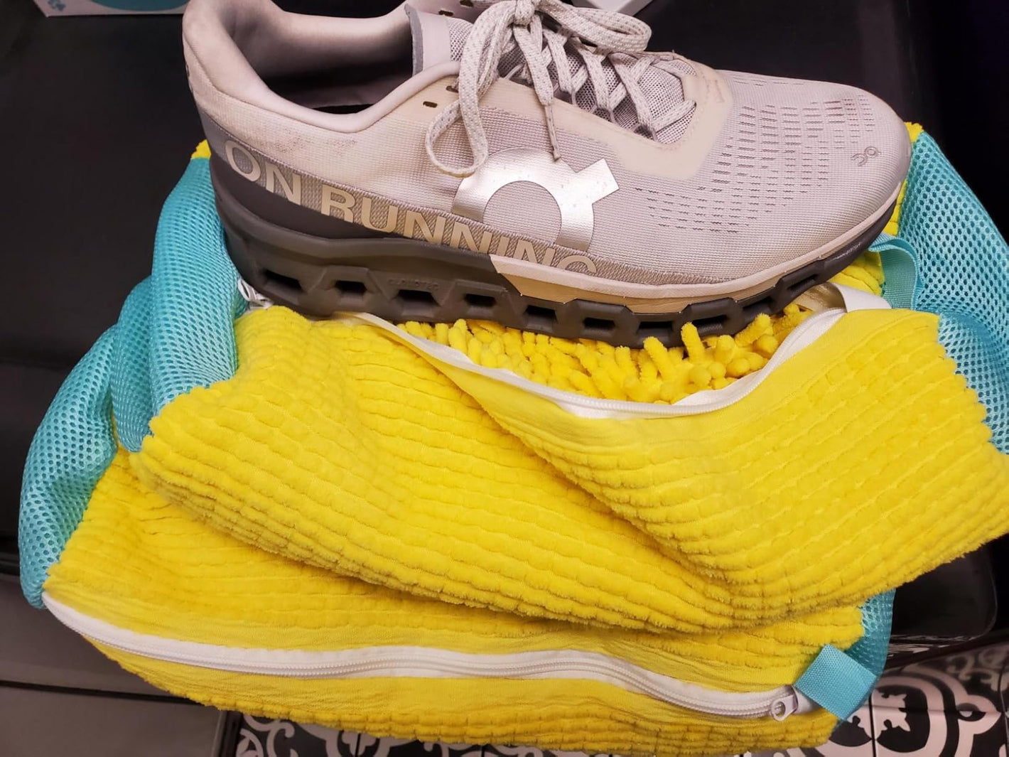 Simplemente guarde sus zapatos en esta suave bolsa protectora y deje que la lavadora haga el trabajo.