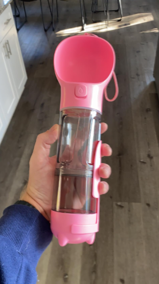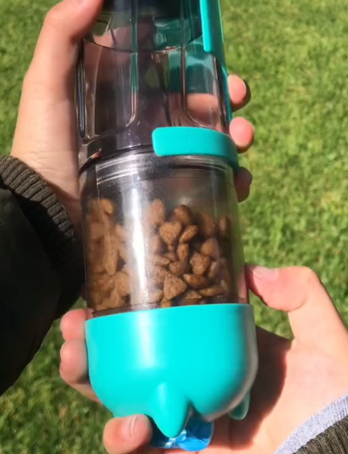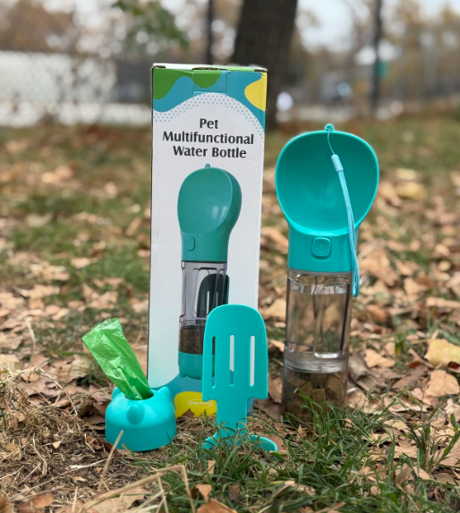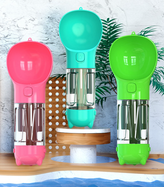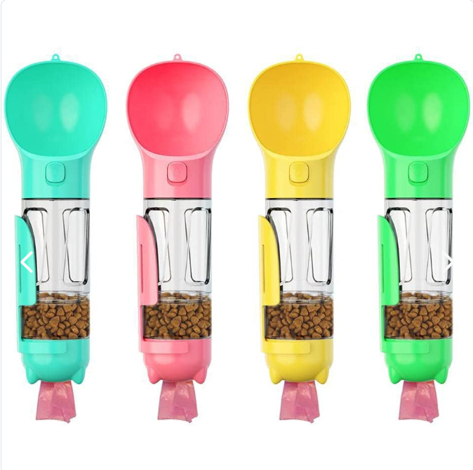 La botella 3 en 1 para mascotas convina el bebedero, el vaso de agua, la caja de comida. Viene con una pala para recoger, que esta pegado en el vaso cuando no está en uso. Puede almacenar bolsas de basura al final del vaso.