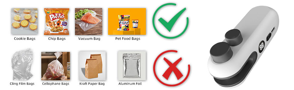 Es adecuada para envasar varias papas fritas, galletas, sándwiches, cereales, dulces, pan, ensaladas, comida para mascotas, bolsas de comida, bolsas de vacío, etc. También es adecuada para bolsas de película de poliéster y bolsas de plástico, pero NO ADECUADO PARA embalaje, bolsas de celofán, bolsas de papel kraft, bolsas de aluminio puro o bolsas delgadas para almacenar alimentos.